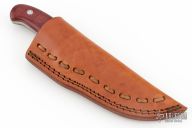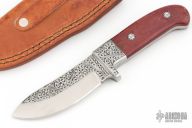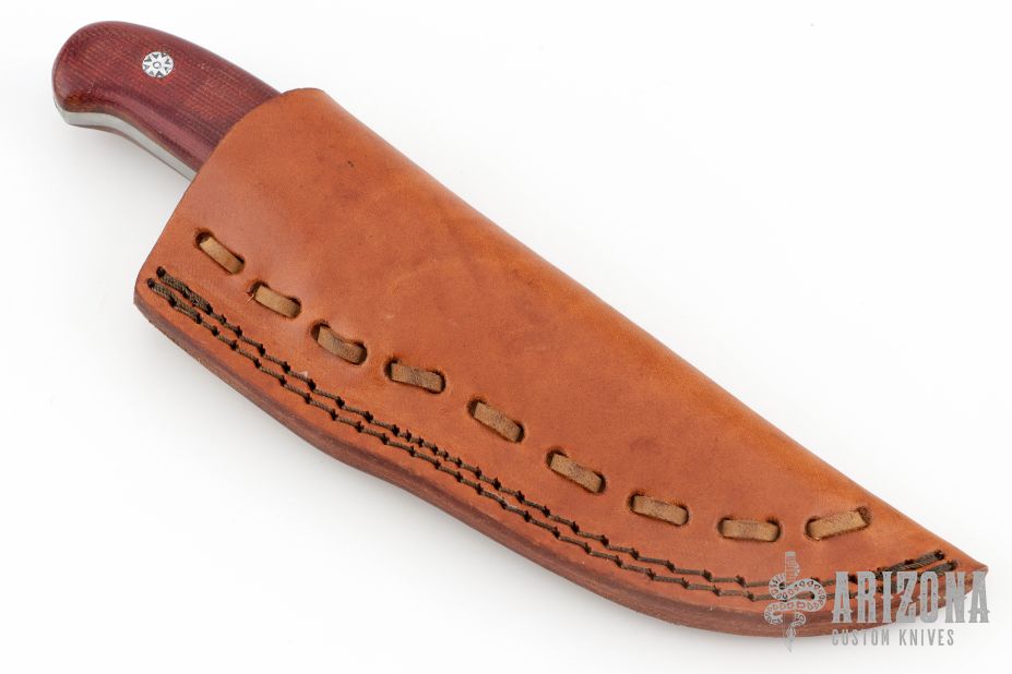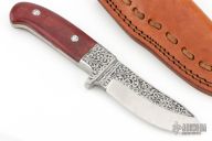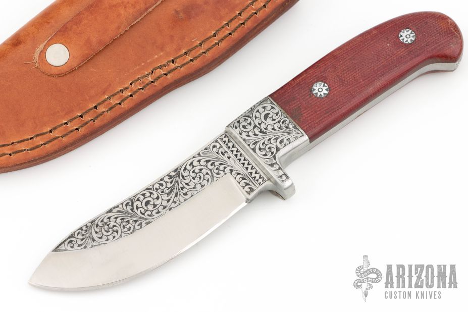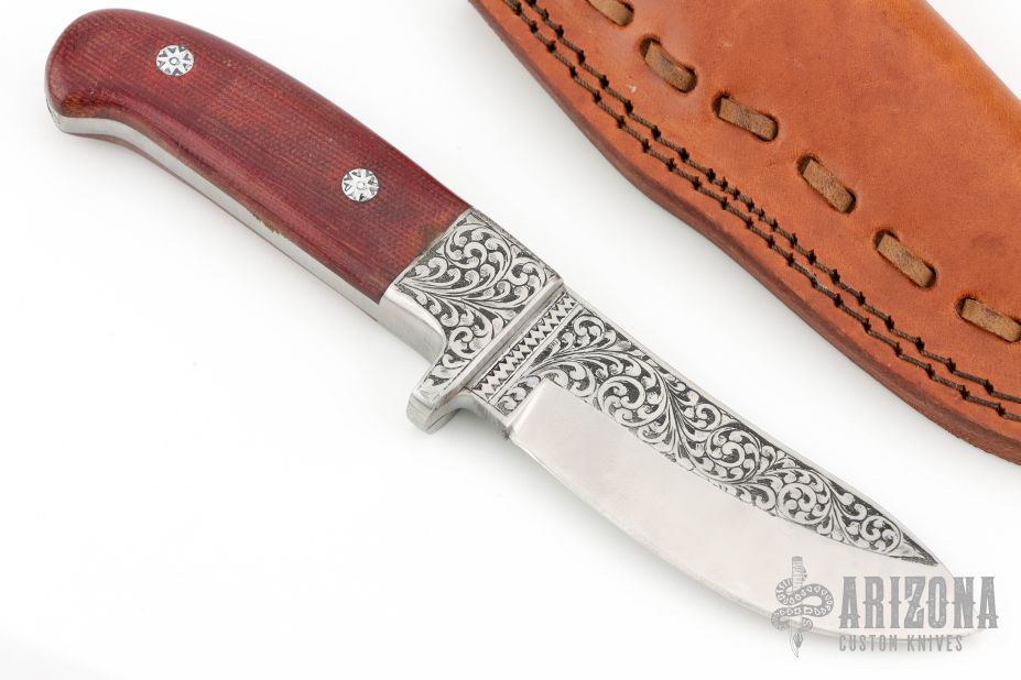 This knife features a satin finished blade with engraved flats and spine, .210" blade stock and 1.200" blade depth, full tang construction. The handle has engraved stainless steel bolsters, red canvas micarta scales with engraved pins. Comes with a brown leather sheath. Has an oxidation spot on the under side of the tang, otherwise excellent condition.