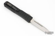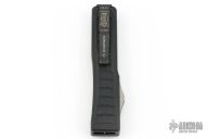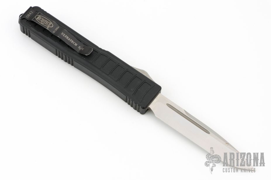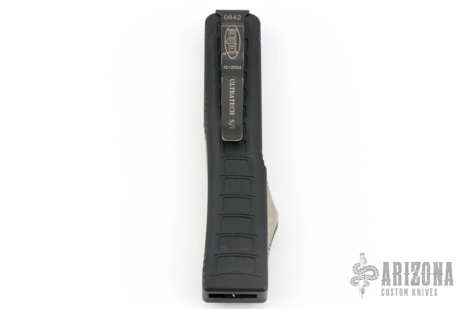 This Ultratech II by Microtech features a satin finished blade. The handle has a black aluminum frame with a "stair step" design for better grip. Stainless steel tip down clip marked 12/2004 with s/n 0842. Pretty rare piece. Has some light scuffs and a small oxidation spot on the blade, otherwise good condition.