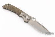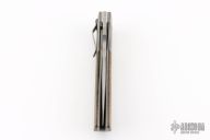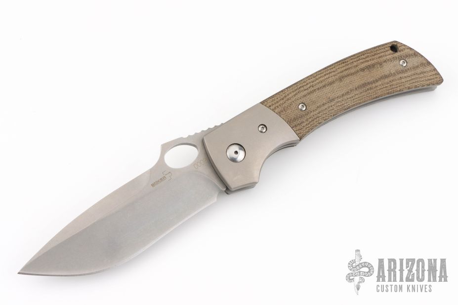 This Squal by Boker is a Charles Marlowe design. It features a tumble finished spear point blade with a thumbhole and notched thumbrest. The handle has bead blasted titanium bolsters, green micarta scales, stainless steel liners, black backspacer, and a tip down stainless steel clip. #0002 on blade. Nice detent, lockup and blade seating. Excellent condition.