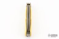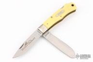 This Yello-Jaket double lockback by Camillus features satin finished blades with nail nicks. The handle has nickel silver bolsters, yellow composite scales, brass liners, stainless steel backspacer. Has some scuffs and scratches, otherwise good condition. "SOY Knife Collectors Club Decatur, Illinois 1 of 17 1990" on the blade. This one is #02