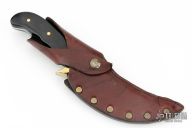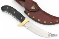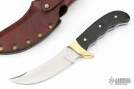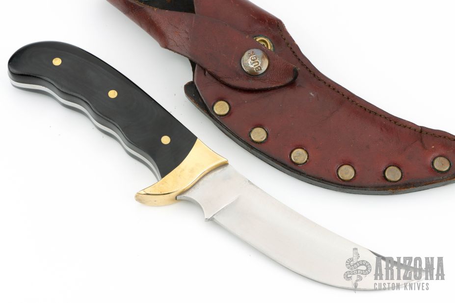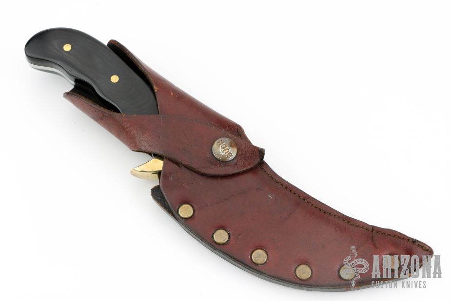 This Kalinga by Buck Knives features a satin finished upswept blade, .178" blade stock and 1.27" blade depth, full tang construction. The handle has brass guard, black linen micarta scales with brass pins. Comes with a brown leather sheath. Has some scratches, and patina. Great condition for its age.