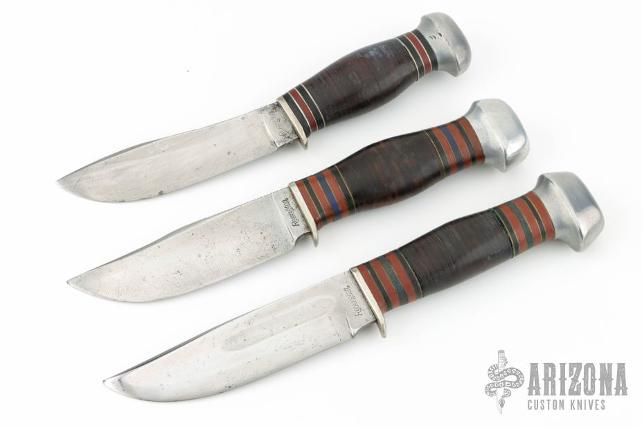 This Remington has .152" blade stock and 1.118" blade depth, hidden tang construction. The handle is comprised of an aluminum guard, red and black spacers, stacked leather grip and aluminum pommel. Comes in a zipper case. Has some oxidation and scratches, has been resharpened. Has some pitting. Fair condition overall.