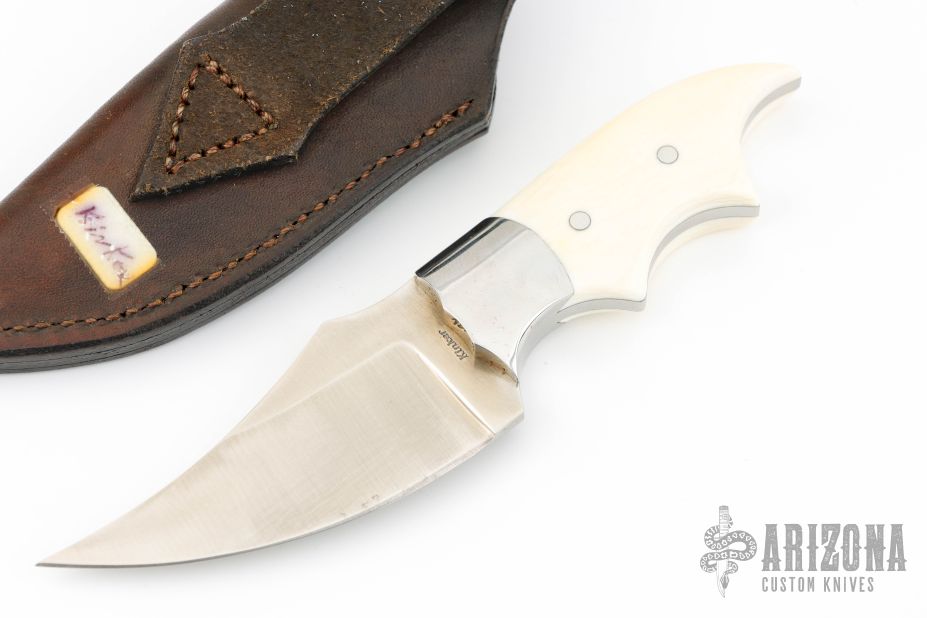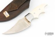 This knife by Mike Kinker features a satin finished blade with .115" blade stock and 1.274" blade depth, full tang construction. The handle has dovetailed stainless steel bolsters, mammoth ivory scales with stainless steel pins. Comes with a hand tooled brown leather sheath. Excellent condition.