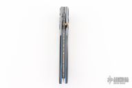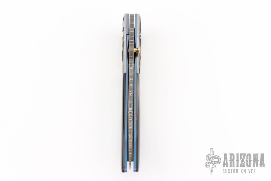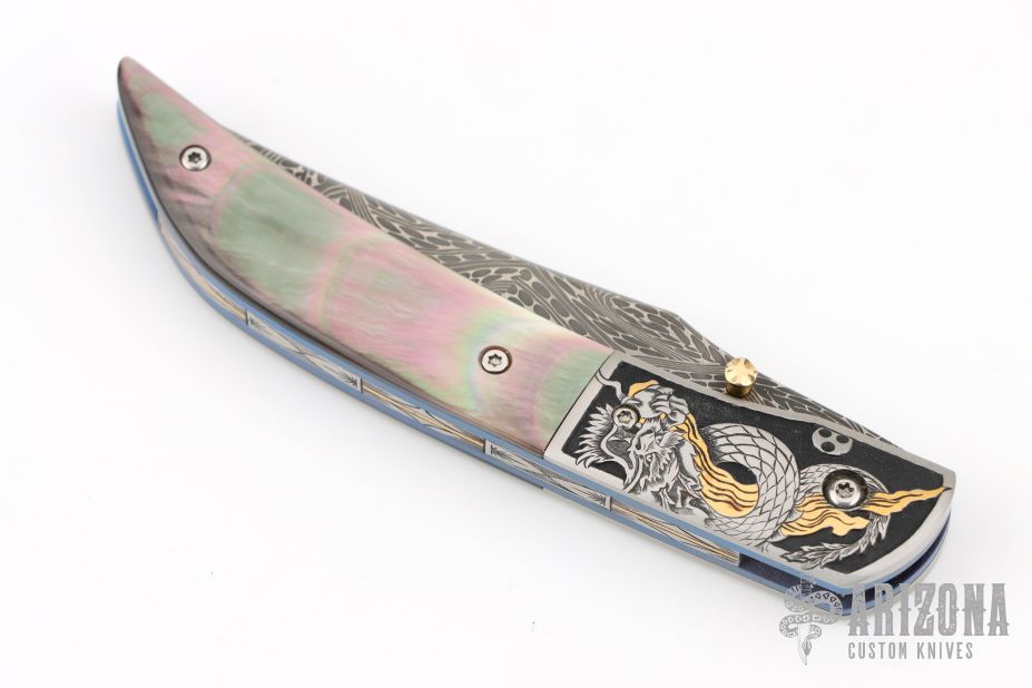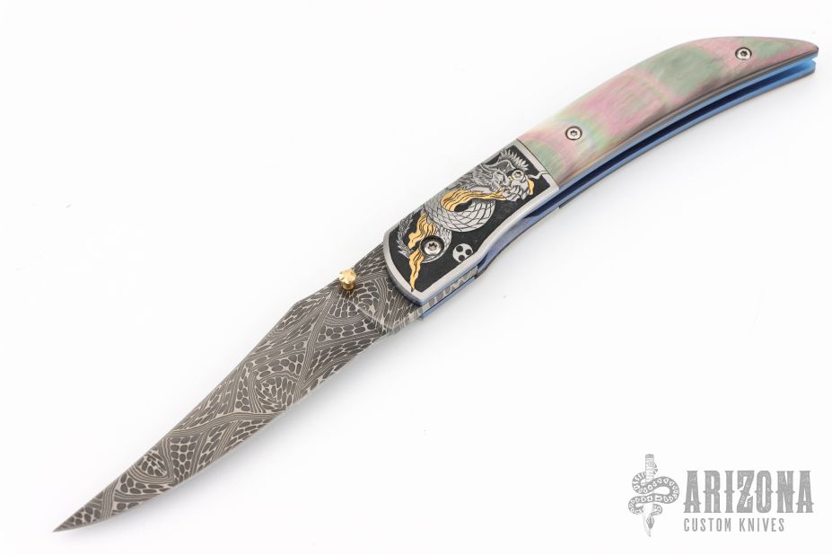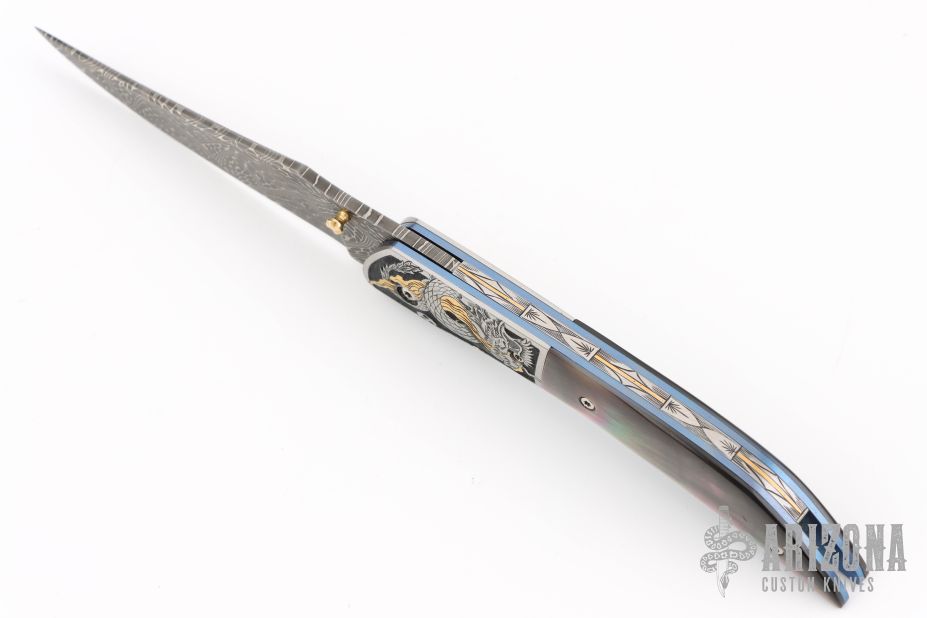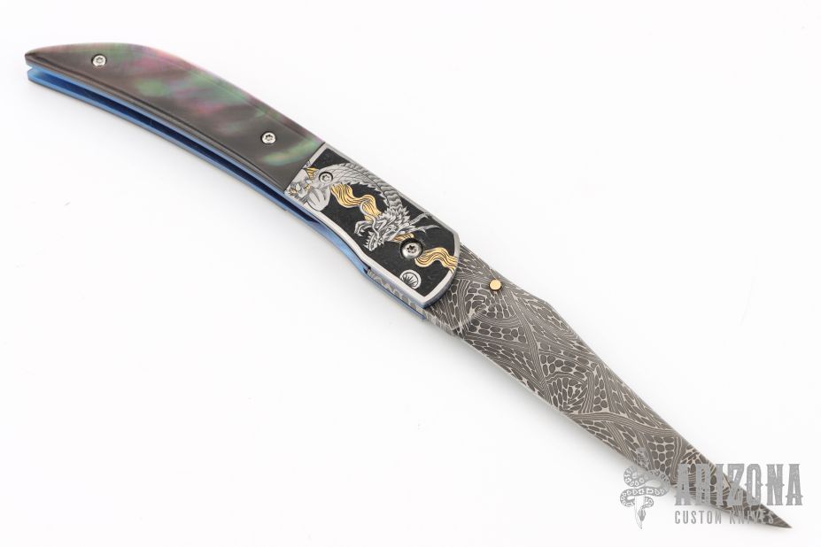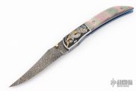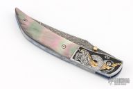 This knife by Jody Muller features a Mosaic Damascus blade with a single gold thumbstud. The handle has engraved and gold inlaid stainless steel bolsters, black lip pearl scales, anodized titanium liners, and an engraved and gold inlaid stainless steel backspacer. Nice detent, lockup and blade seating. Excellent condition. Engraving and Damascus done by Jody Muller.