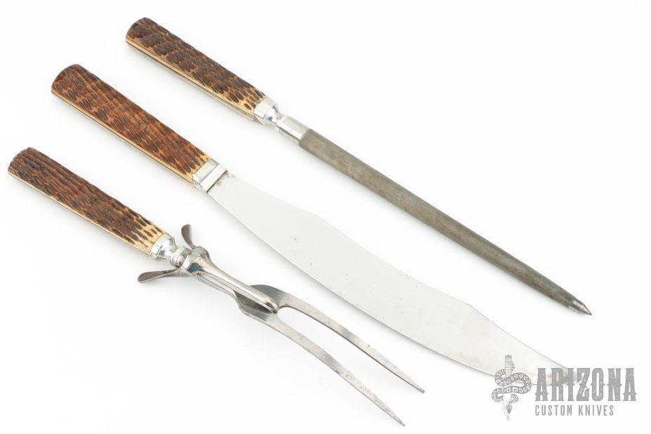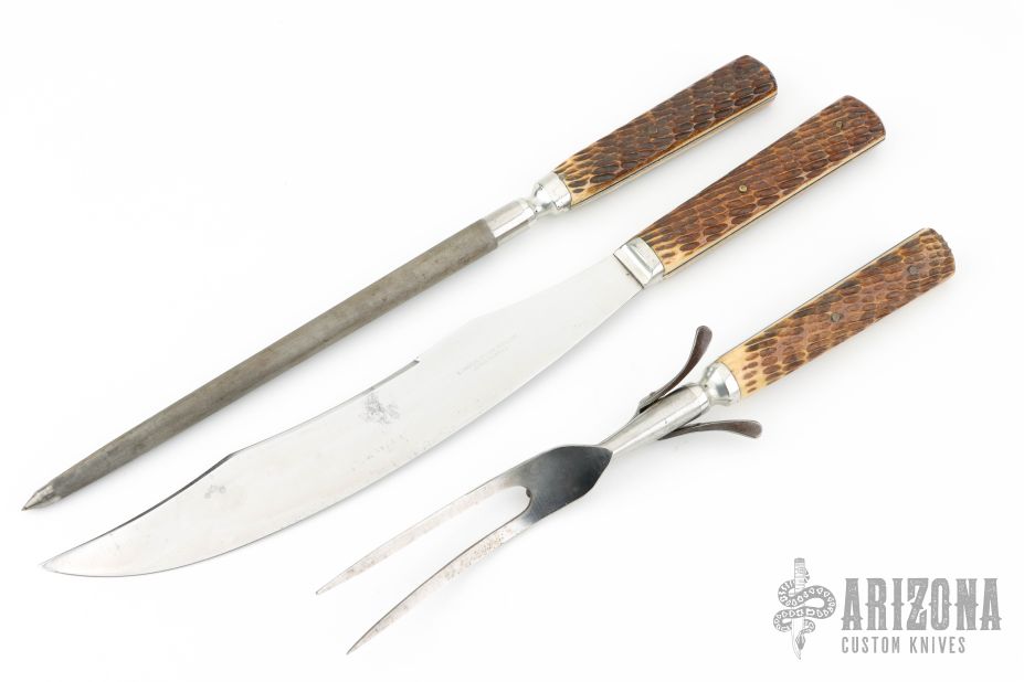This Antique Carving Set by Landers Frary & Clark, features a satin finished blade with false top edge, .065" blade stock and 1.067" blade depth, hidden tang construction. The handle has a silver collar and a jigged stag grip. Comes with a matching fork and sharpening steel. Comes in a zipper case. Has scuffs, scratches, and patina. Good condition for its age. Fork is marked "Pat July 6th 1886".