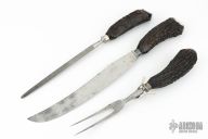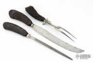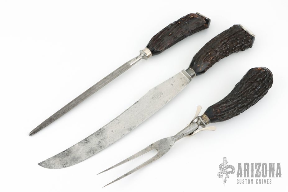 This Antique Carving Set by Landers Frary & Clark, features a satin finished blade with false top edge, .065" blade stock and 1.067" blade depth, hidden tang construction. The handle has a silver collar and a crown stag grip. Comes with a matching fork and sharpening steel. Comes with a zipper case. Has scuffs, scratches, and patina. Good condition for its age.