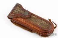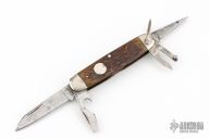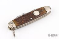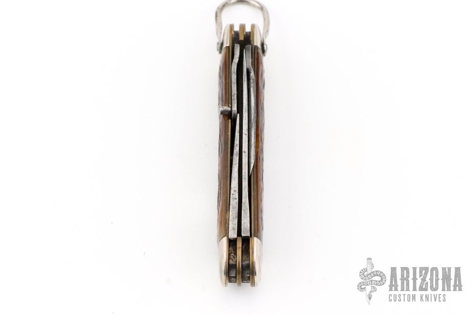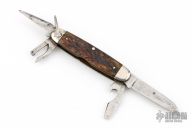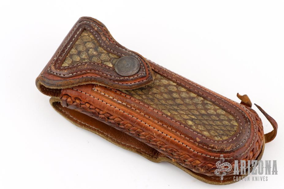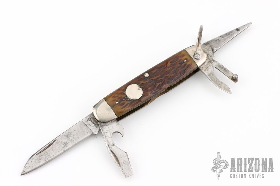 The Scout, by Remington features a drop point, can opener, and awl. All tools are made of stainless steel. The handle is jigged bone. The knife has silver pins, along with brass liners along the spine. Bolsters are nickel silver. The Remington insignia is visible on one side. Has rust, patina, and scratches, good condition for its age. Comes in a very nice leather belt sheath with snake skin inlays.