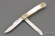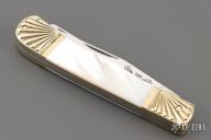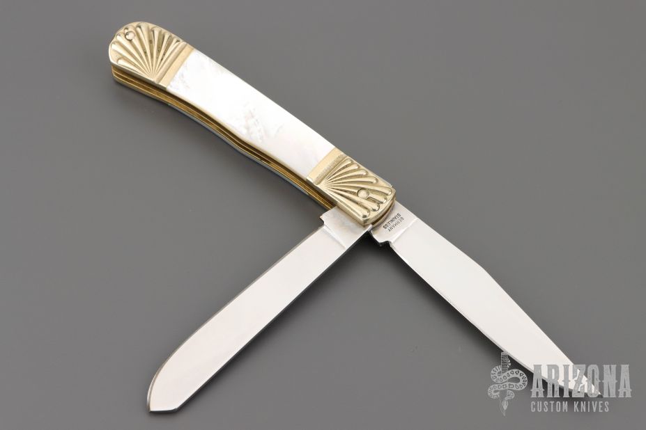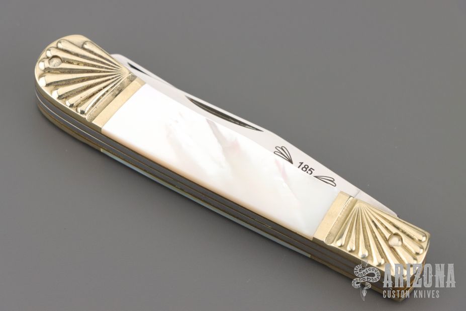 This knife features two mirror polished blades with nail nicks. The handle has scalloped nickel silver bolsters, mother of pearl scales, brass liners and stainless steel springs. Excellent condition. #185 on the blade.