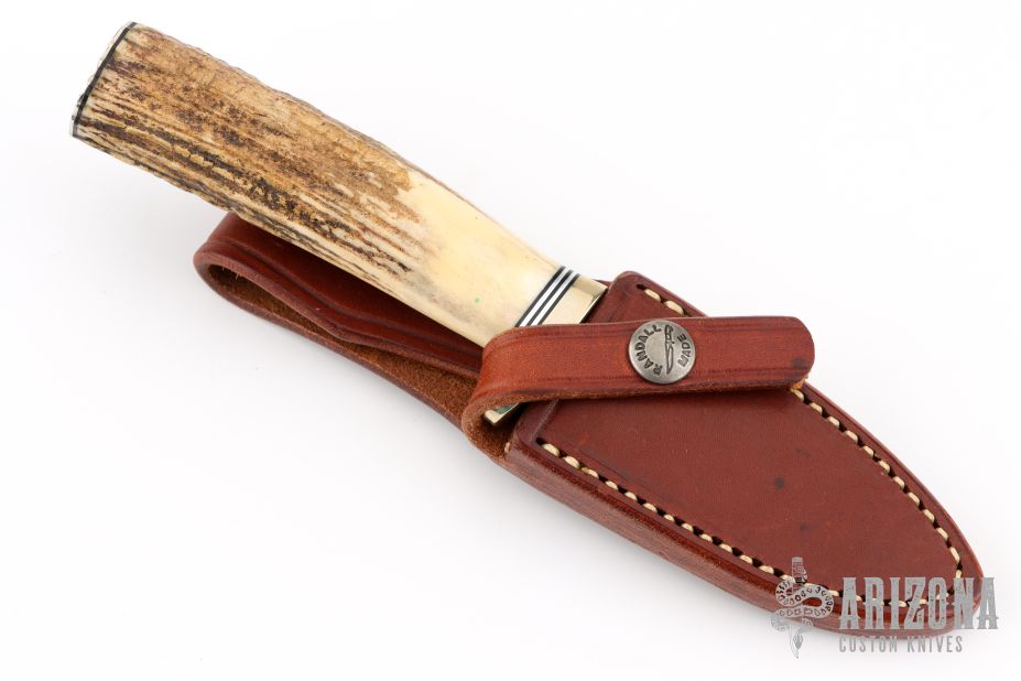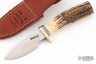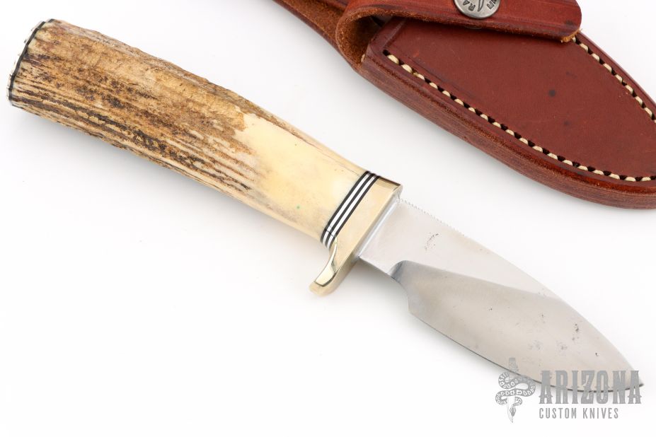 The Model 11 is the original drop point blade. Designed by Tommy Thompson, noted Alaskan guide, in 1952 for big-game skinning, with point dropped below top of blade to prevent cutting too deeply through skins when used point first. The blade is satin finished with a notched thumbrest, .159" blade stock and 1.021" blade depth, hidden tang construction. The handle has a brass guard, stag handle, black/duralumin spacers and matching butt. Comes brown leather sheath with belt loop. Has some light patina. Excellent condition.