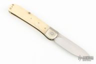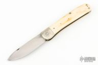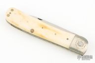 This Lockback by "P Bone" (please let us know if you know this makers full name) features a hand rub satin finished blade with nail nick. The handle has engraved nickel silver bolsters, brass liners, engraved steel backspacer, bone scales, steel backspacer with checkered lock release. The blade is engraved "P Bone". Has scratches, otherwise good condition for its age. The lock is a little difficult to release because the spring is flush to the frame. I had to use a plastic stick.