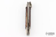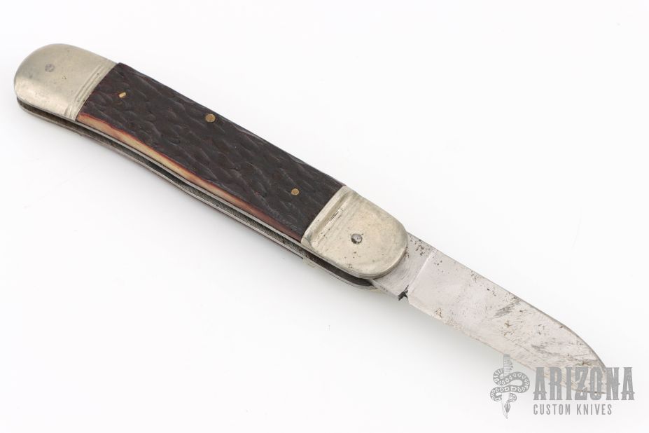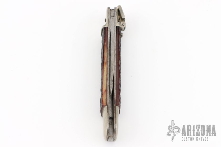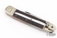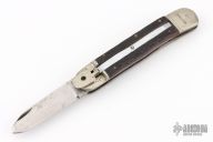 This leverlock auto by Puma features a mirror polished blade, nickel silver double bolsters, bone scales, and brass liners and pins. The blade has been completely reground. Heavy scuffs/scratches.