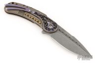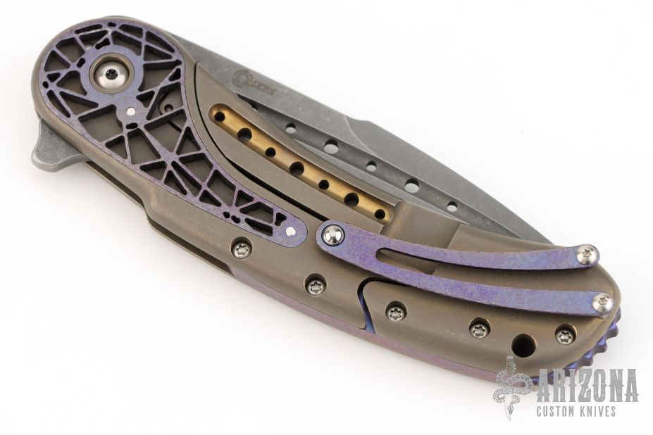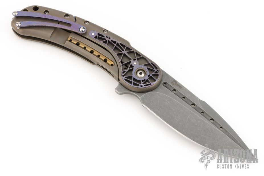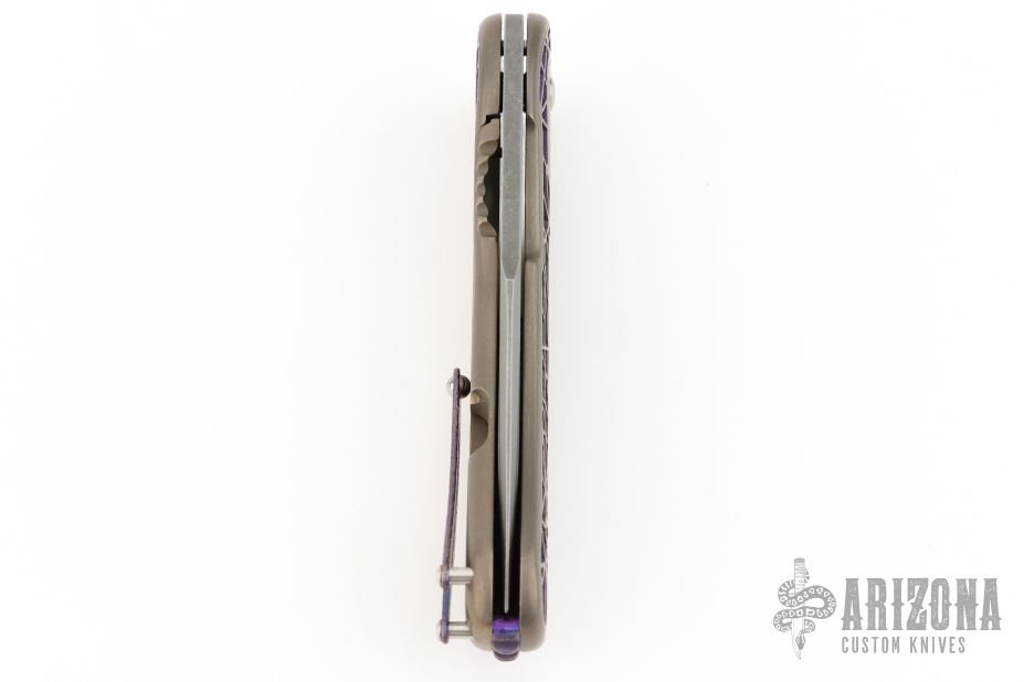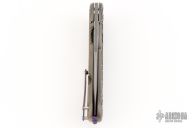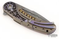 This Bodega 2.0 from Begg Knives features a dark tumble finished blade with swedge, notched thumbrest, fullers and flipper. The handle is comprised of a tumbled and anodized titanium frame with skeletonized and anodized titanium inlay over a notched and file worked titanium backspacer. Matching tip up clip and lanyard hole in pommel. Great blade seating, detent and lock up. Includes padded and zippered case. Excellent condition.