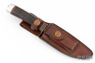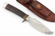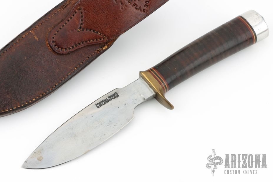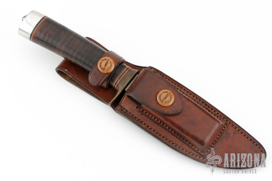 This Model 11-5 by Randall Made Knives features a satin finished blade with thumb rest, .232" stock and 1.286" blade depth, hidden tang construction. The handle has a brass guard, stacked leather grip and duralumin butt. This knife has red/yellow/black spacers. Comes with brown leather sheath with brown buttons and blue sharpening stone. Has been used and resharpened, has some oxidation, otherwise good condition. Exceptionally rare Randall marked brown button sheath, appears to be late Hieser or a Jim Stockman made leather, which would date the knife 1959 to 1963