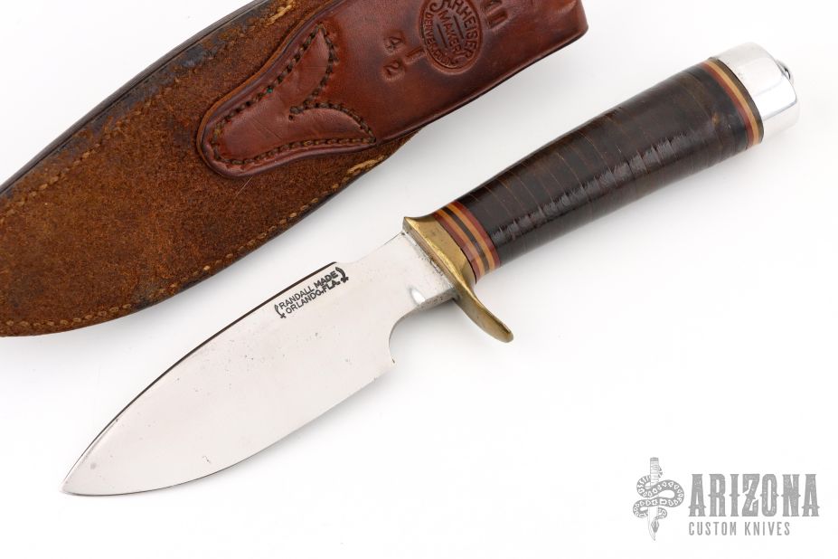 This Model 11-4.5 by Randall Made Knives features a satin finished blade with notched thumb rest, .232" stock and 1.286" blade depth, hidden tang construction. The handle has a brass guard, stacked leather grip and duralumin butt. This knife has red/yellow/black spacers. Comes with brown leather sheath with brown buttons and blue sharpening stone. Has been used and resharpened, has some oxidation, otherwise good condition.