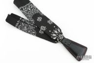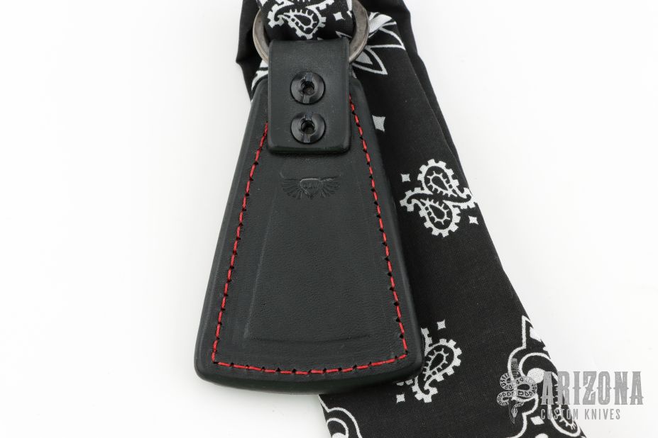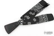 The Cowbell Sap is RMJ's take on the bandana sap. The Cowbell keeps your bandana or handkerchief handy, and sitting at the end of your bandana, is the perfect way to ring a bell! This Slugshot variation features black leather with contrasting red stitching and a bandana for some extra leverage. Constructed from cowhide with a lead core. Thick enough to lay on a wallop, and easy to carry. Monkey Edge Exclusive.