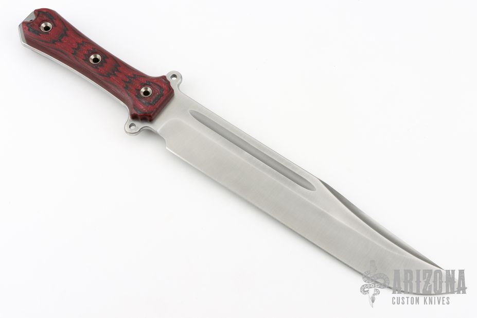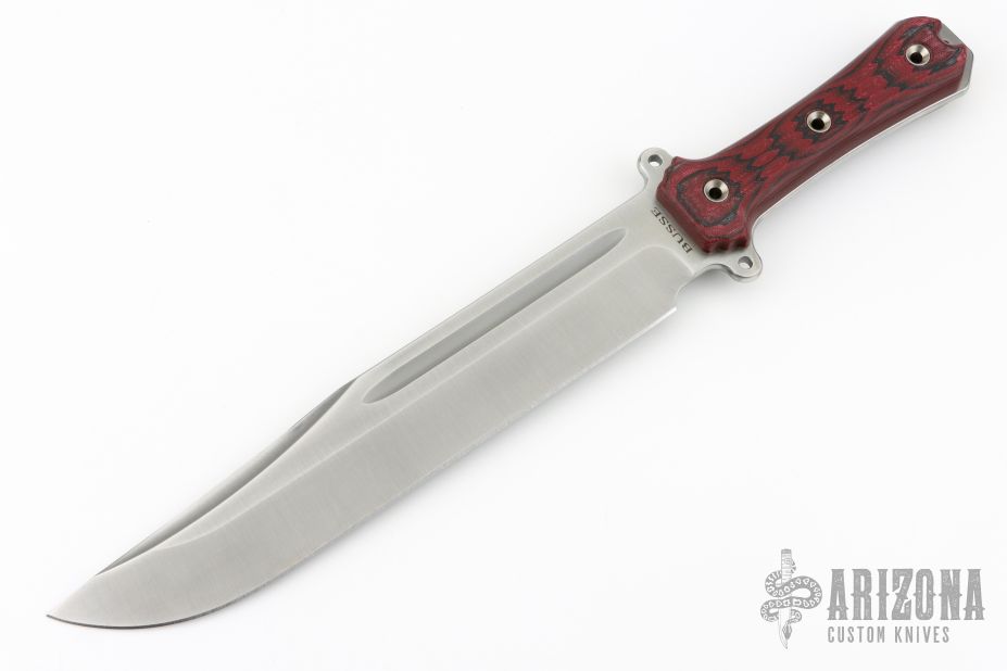This ForeFather Bowie by Busse features a competition finished blade with false top edge and fullers, .211" blade stock and 1.782" blade depth, full tang construction with black/red G-10 scales. New from maker.