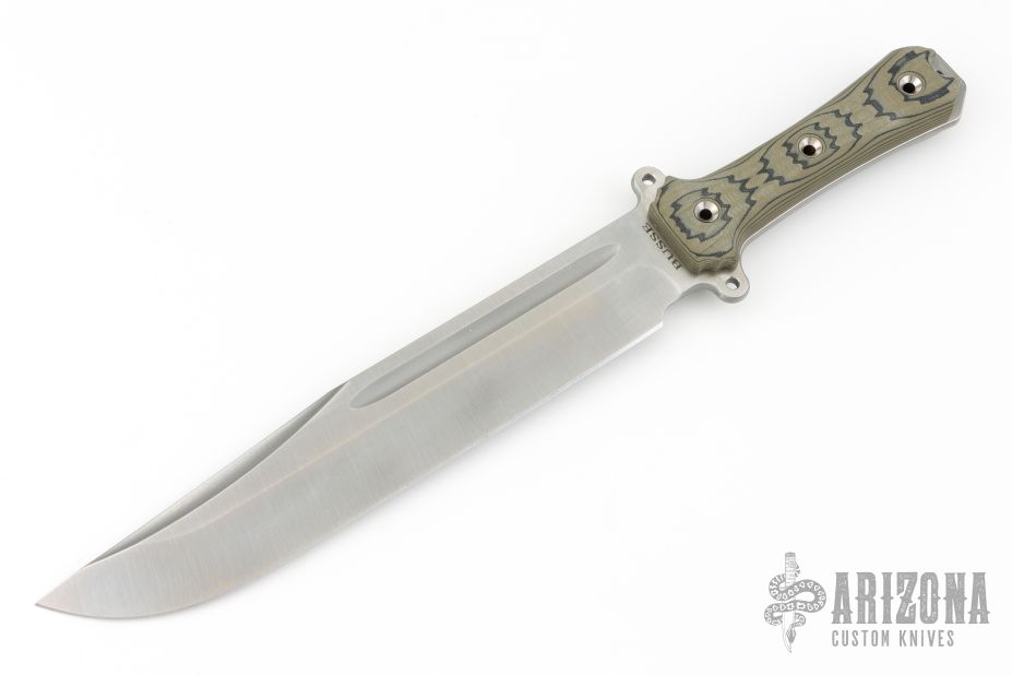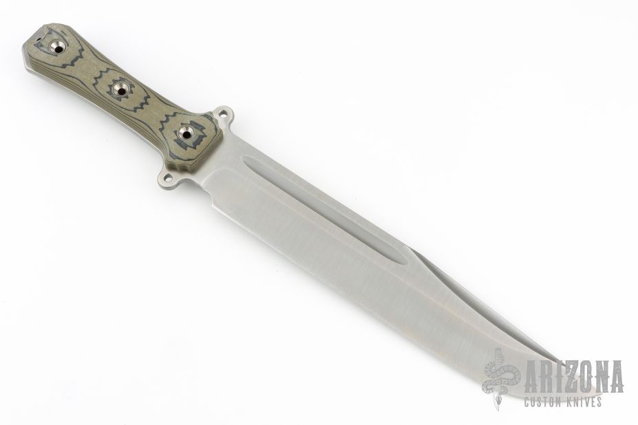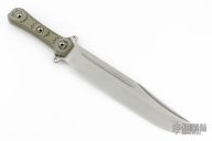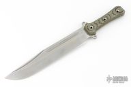 This ForeFather Bowie by Busse features a competition finished blade with false top edge and fullers, .211" blade stock and 1.793" blade depth, full tang construction with black/green G-10 scales. New from maker.