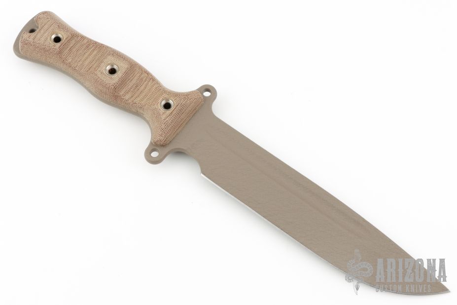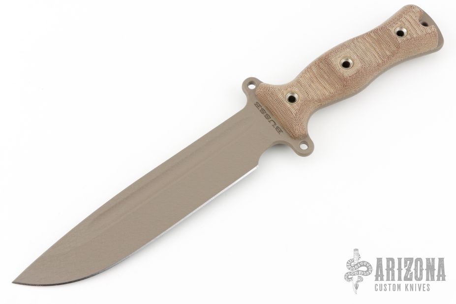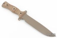 This Team Gemini Light Brigade by Busse Combat Knife Company features a drop point sage coated blade with fullers, .221" blade stock and 1.575" blade depth. The handle has tan canvas micarta scales over full tang construction. Exposed tang pommel with lanyard hole. New from maker.