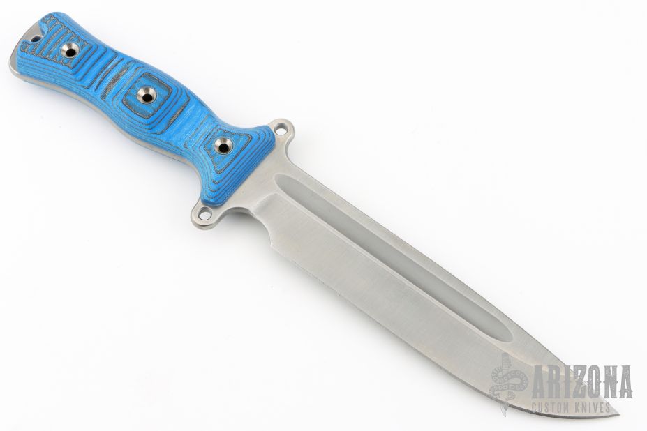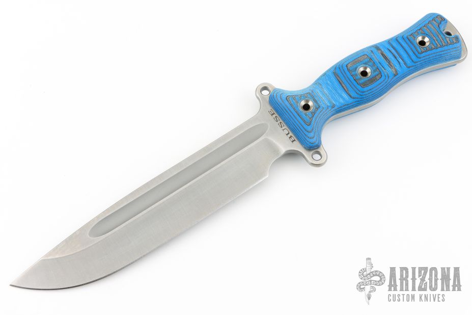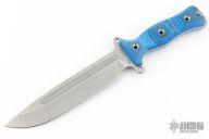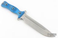This Team Gemini Light Brigade by Busse Combat Knife Company features a drop point competition finished blade with fullers, .212" blade stock and 1.575" blade depth. The handle has black/blue G-10 scales over full tang construction. Exposed tang pommel with lanyard hole. New from maker.