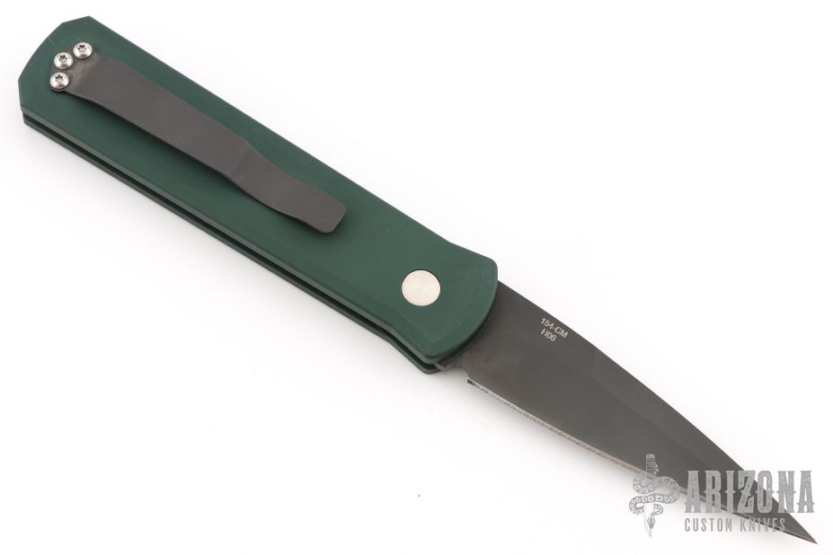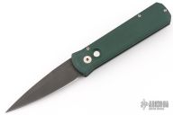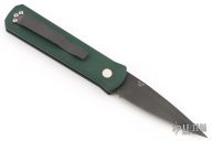 This Godson from Pro-Tech Knives features a black coated spear point blade with swedge. The handle has a green anodized aluminum frame with a black coated stainless steel tip up clip. Has a few light scuffs otherwise the knife is in Excellent Condition.