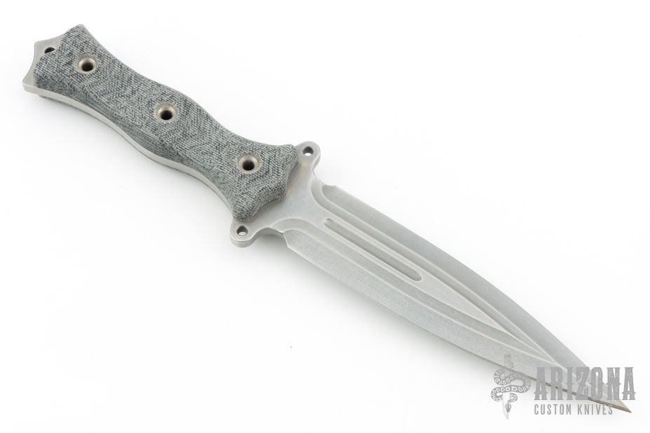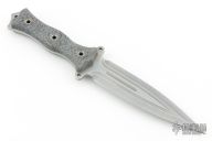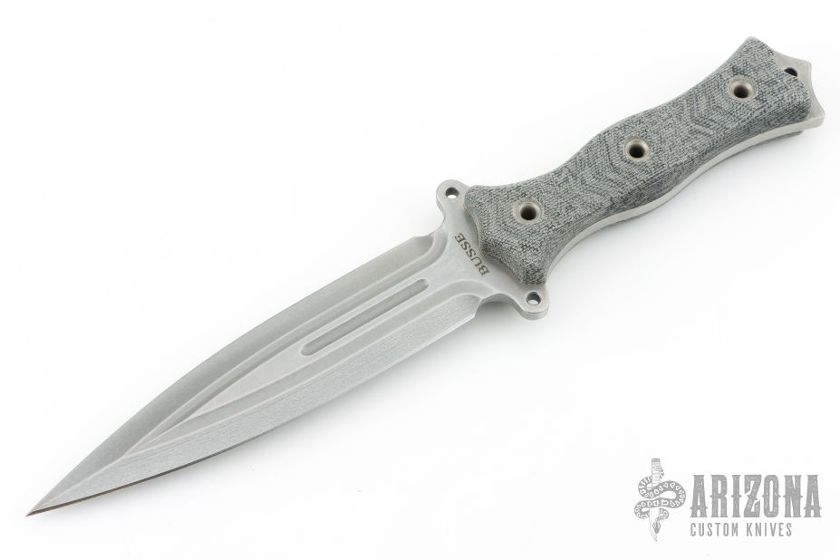 This FMV6 by Busse Knives features a stonewash finished double-edged blade with fullers, .210" blade stock and 1.355" blade depth, full tang construction with black canvas micarta scales. New from maker!
