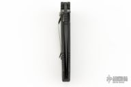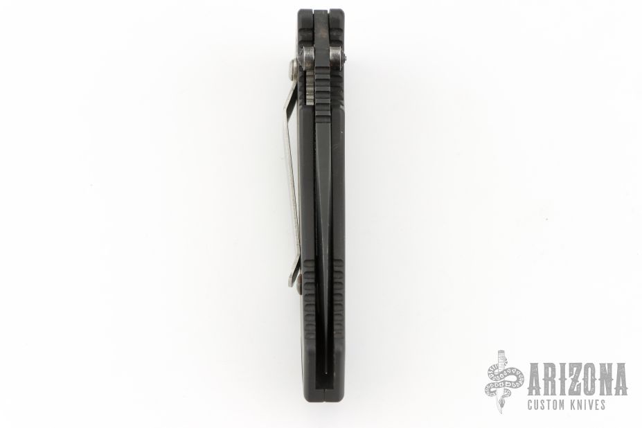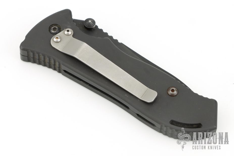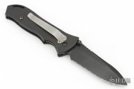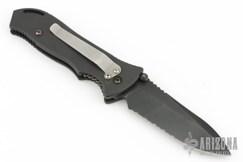 This knife from Masters of Defense features a black coated spear point blade with swedge, notched thumb rest, dual thumb studs and partially serrated edge. The handle has a black anodized aluminum with non slip inlays on the "A" side over an inlaid steel lockbar. Tip down steel pocket clip. Lanyard hole in pommel. Has some light scuffs/scratches otherwise the knife is in good condition.