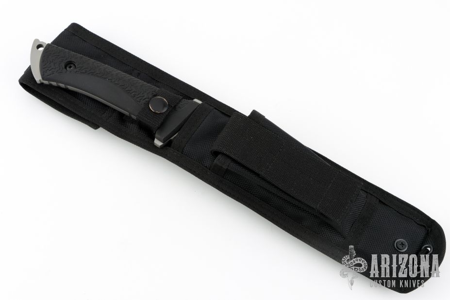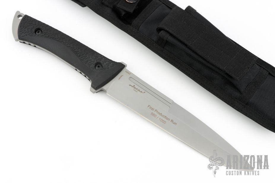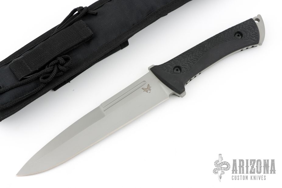 This Fecas Design Offsider by Benchmade features a bead blasted blade with fullers and false top edge, .217" blade stock and 1.510" blade depth, full tang construction. The handle has rubber scales, extended tang with lanyard hole. Comes with original box, papers and black nylon sheath. Excellent condition.