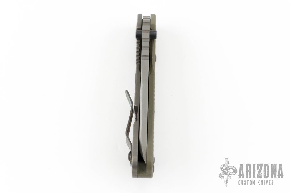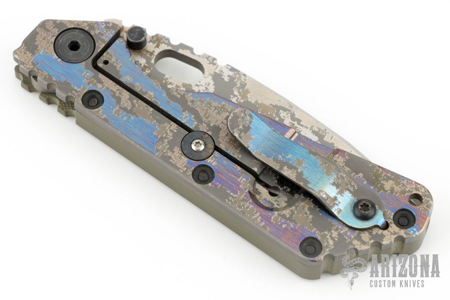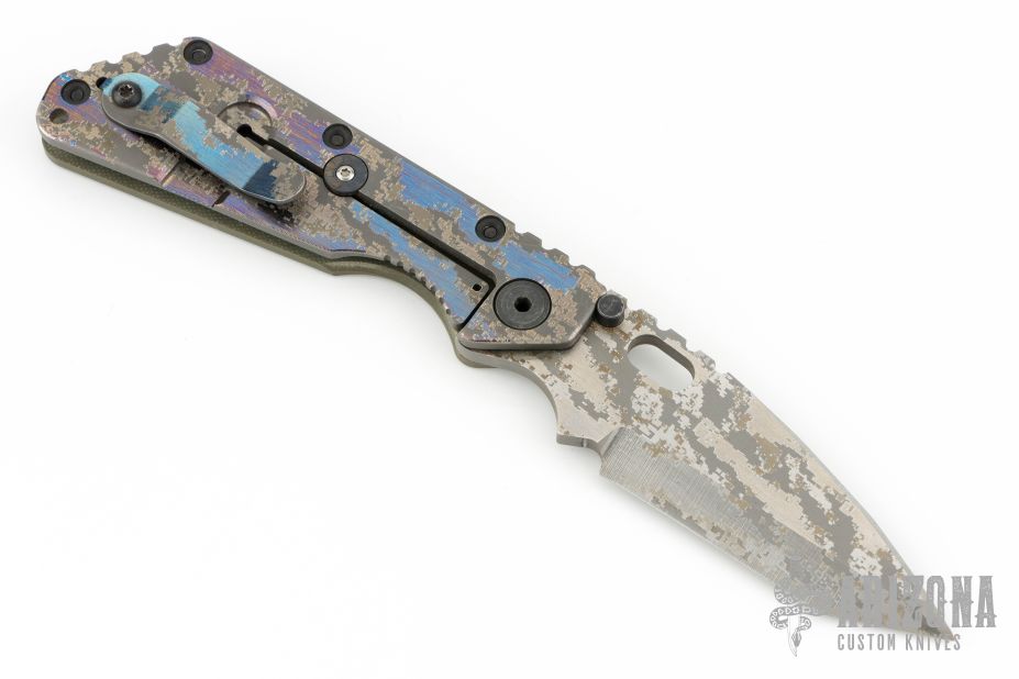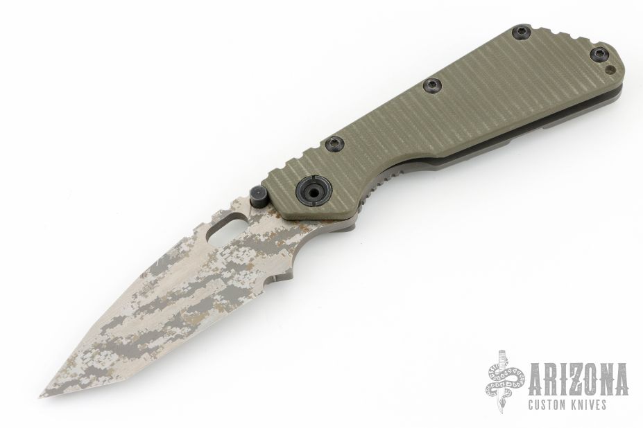 This SMF framelock folder by Strider Knives features a digicam finish blade and a textured green G-10 and digicam titanium frame. Digicam Titanium clip. Includes Hinderer "Lock Bar Stabilizer" for maximum reverse lock retention. Nice detent and blade seating. Comes with a Strider case. Has some light scratches, great condition otherwise.