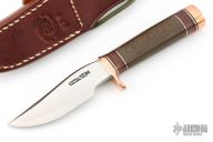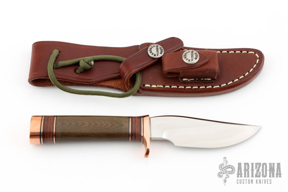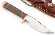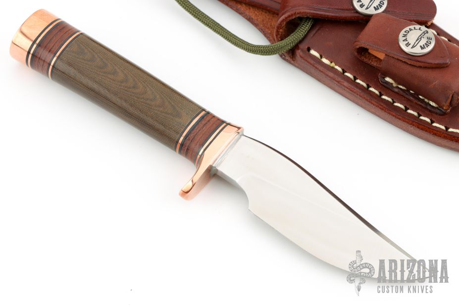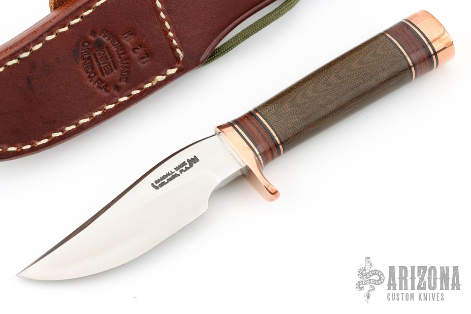 The miniature Model 27 debuted in Randall's 2012 75th anniversary catalog and is the first catalog miniature model. This knife has a 3.5" stainless steel blade, .170" blade stock and 1.037" blade depth, hidden tang construction. The handle has a copper guard and butt, green micarta grip, and black/copper/leather spacer pattern. It comes with a brown leather sheath and a zippered case. Excellent condition.