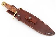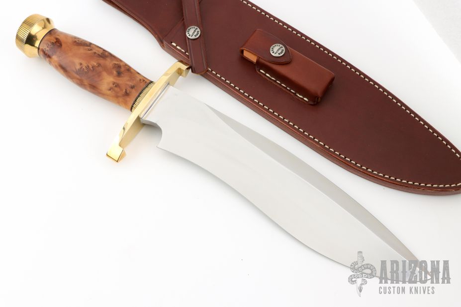 This Sasquatch by Randall Made Knives features a satin finished recurve blade with sharpened top edge, .327" blade stock and 2.288" blade depth, hidden tang construction. The handle has a lugged brass guard and scalloped butt, Thuya Burl grip with brass escutcheon and black/brass spacers. Comes with a brown leather sheath and zippered case. #938 on the blade. Excellent condition.