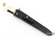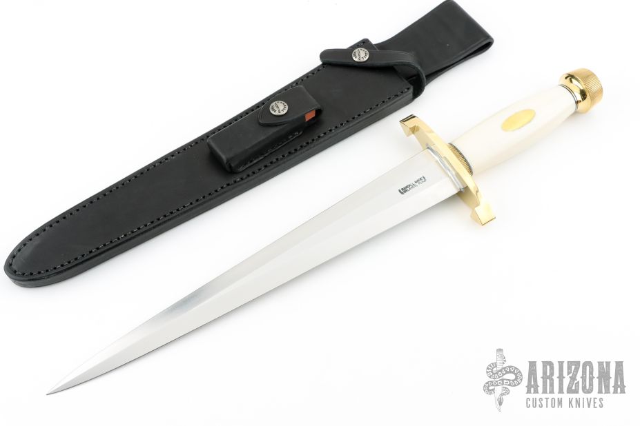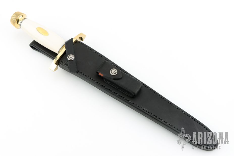 This Model 13-12 Arkansas Toothpick by Randall Made Knives features a satin finished carbon steel double edged blade with .194" blade stock and 1.624" blade depth, hidden tang construction. The handle has a lugged brass guard and scalloped butt, Ivorite linen micarta grip with black and brass spacers, brass oval escutcheon. Comes with a black leather sheath and a zippered case. Excellent condition.
