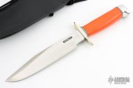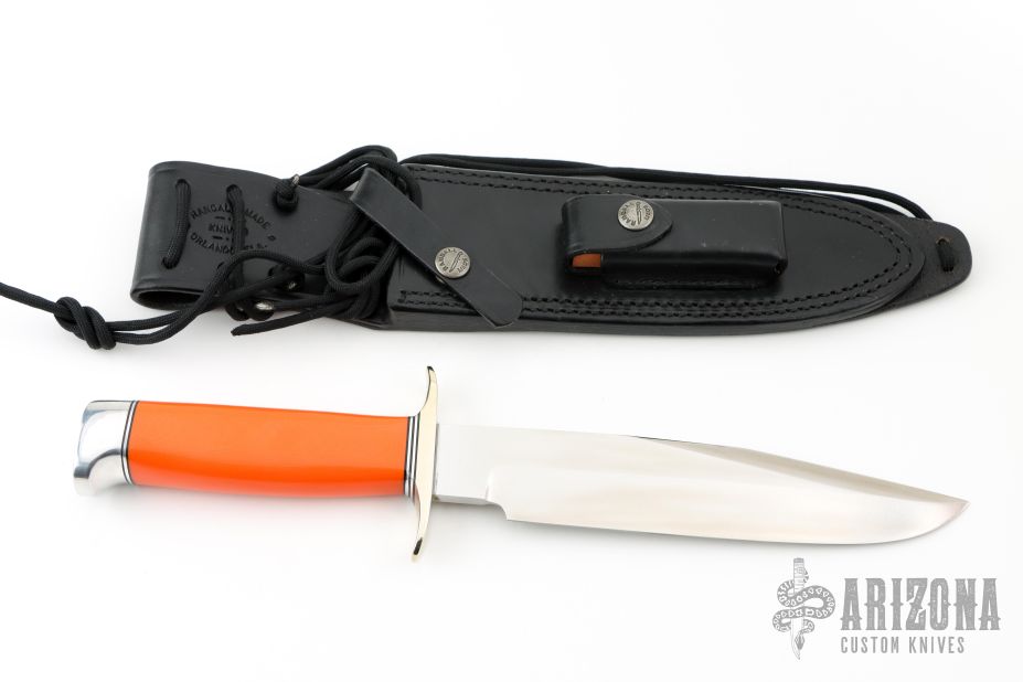The Model 14CDT by Randall Made Knives features satin finished blade with sharpened top edge, .216" blade stock and 1.440" blade depth, hidden tang construction. The handle has a nickel silver guard and duralumin crows beak butt, orange G-10 grip with black and duralumin spacers. Comes with a black leather sheath and a zippered case. Excellent condition.