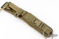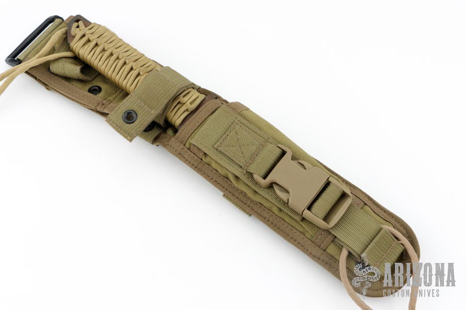This ED CuBe EOD Knife by Strider features a copper beryllium blade with serrated spine, .274" blade stock and 1.294" blade depth, full tang construction with tan paracord wrapped handle. Comes with a nylon sheath. Has some scuffs, otherwise excellent condition. This one is stamped "S30V" on the guard, but it is clearly Copper Beryllium.