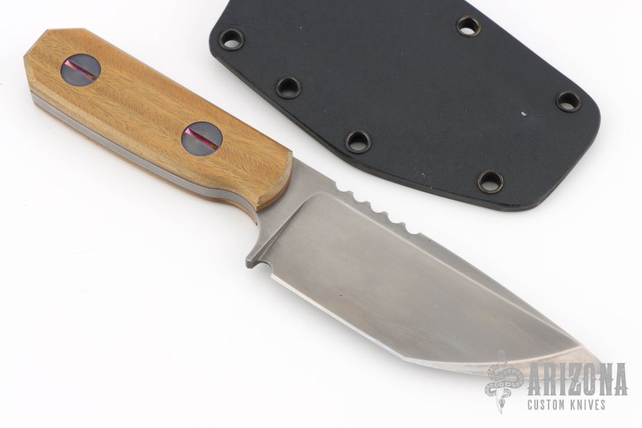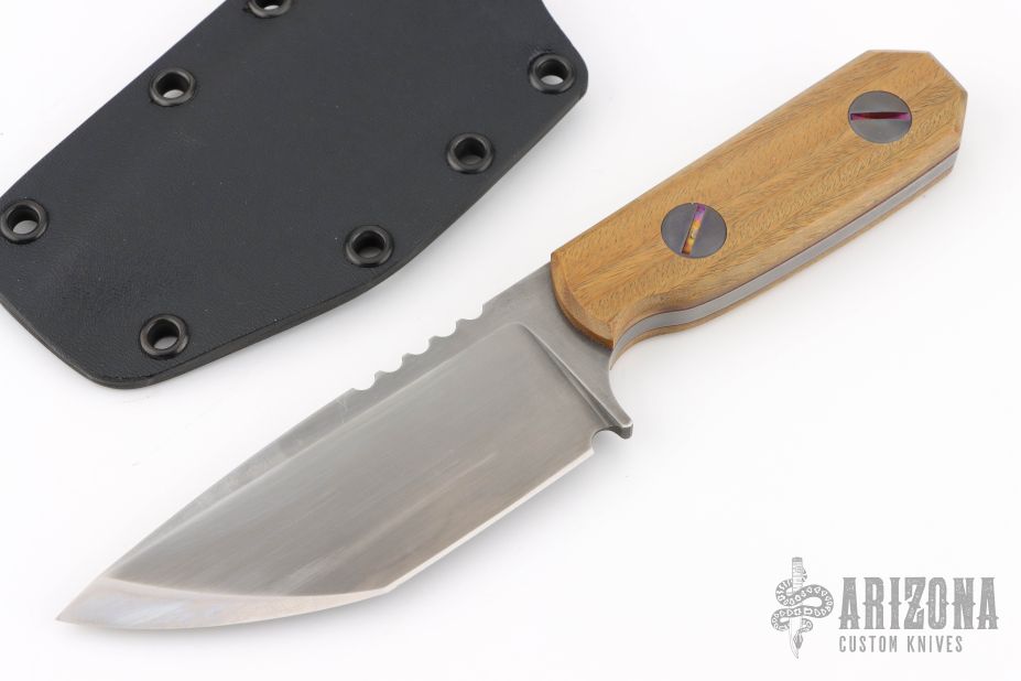 This Elmo by Dark Earth Tactical features a satin finished blade with notched thumb rest, .199" blade stock and 1.478" blade depth, full tang construction. The handle has lignum vitae wood covers. Includes kydex sheath and COA. Has some scratches, otherwise excellent condition.