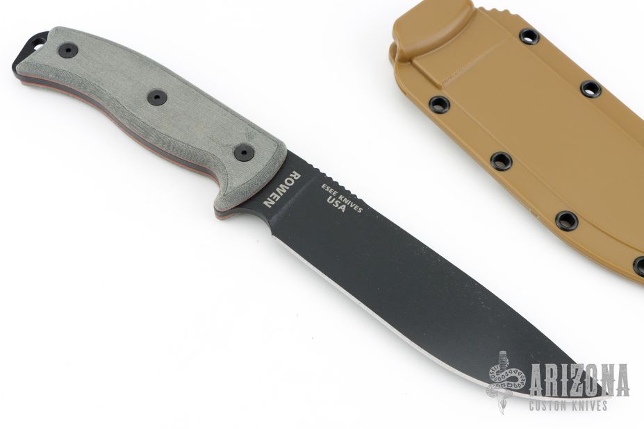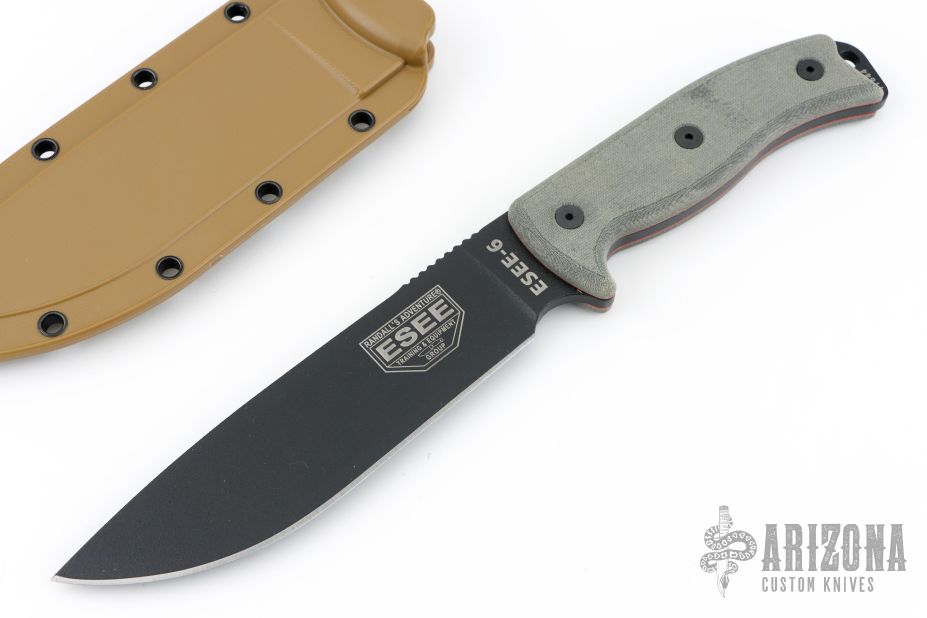 This fixed blade by Esee Knives features a black coated and textured drop point blade with notched thumb rest. .195" blade stock and 1.535" blade depth. Scales are green canvas micarta. Lanyard bail or skull crusher at but. Numbered 11644. Comes with kydex sheath clip and original papers. Item was sealed in the original bag and was opened to write up. Excellent condition.