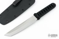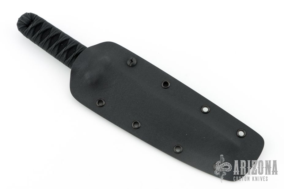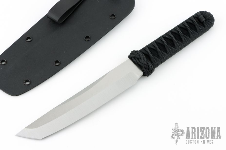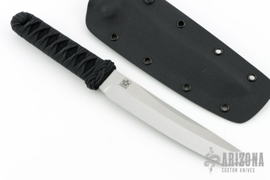 This Fixed Blade by Josh Mason features a satin finish blade with .172" blade stock, 1.217" blade depth with hidden tang construction. The handle has a Turk's head Paracord knot as a guard, and a wrapped handle. Comes with a Kydex sheath and belt loop. Excellent condition.
