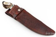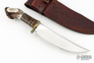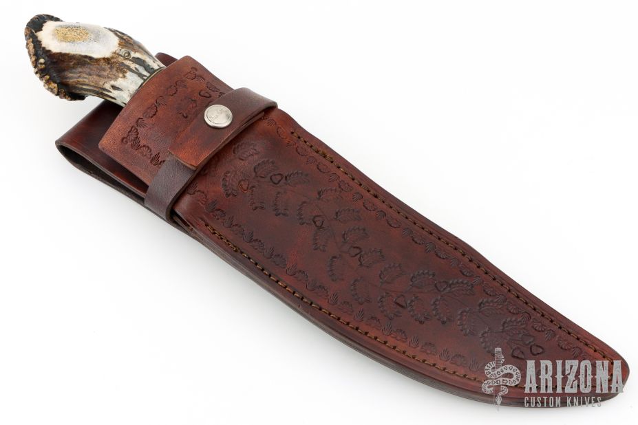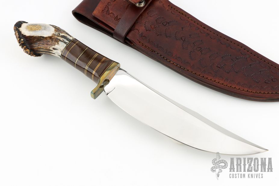 This custom Scagel style Bowie features a mirror polished blade with false top edge, .250" blade stock and 1.890" deep, hidden tang construction. The handle has brass guard, stacked leather handle with black and brass spacers, crown stag butt with a brass pin. Comes with a hand tooled brown leather sheath with belt loop. Excellent condition. Comes with a zippered case.