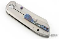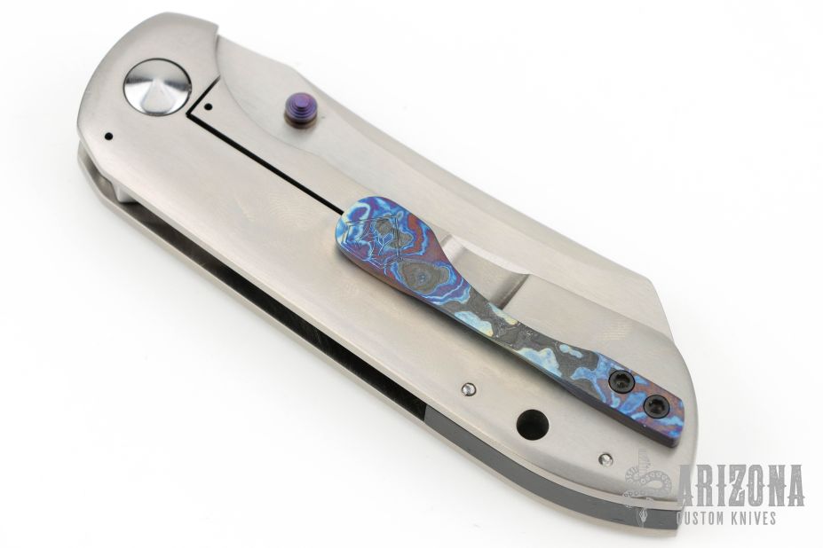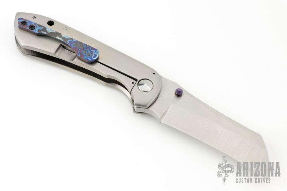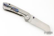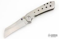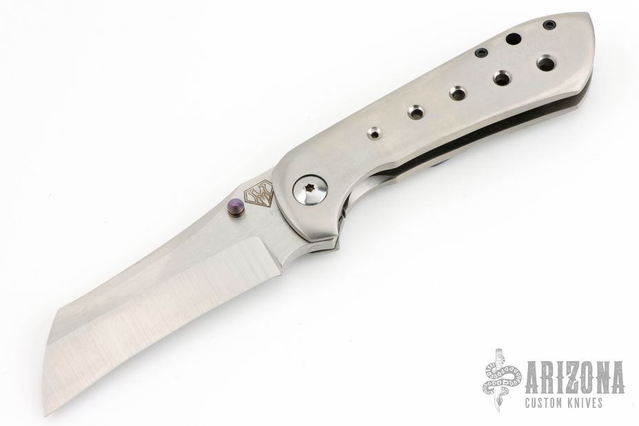 This Rekkr Framelock flipper by Mazur Customs features a satin hawkbill blade with swedge, and dual thumbstuds. The handle has a satin finished titanium frame with hole pattern, carbon fiber backstrap, and Timascus tip up clip. Comes with a zipper case and COA. Has some scuffs and scratches, excellent condition otherwise.