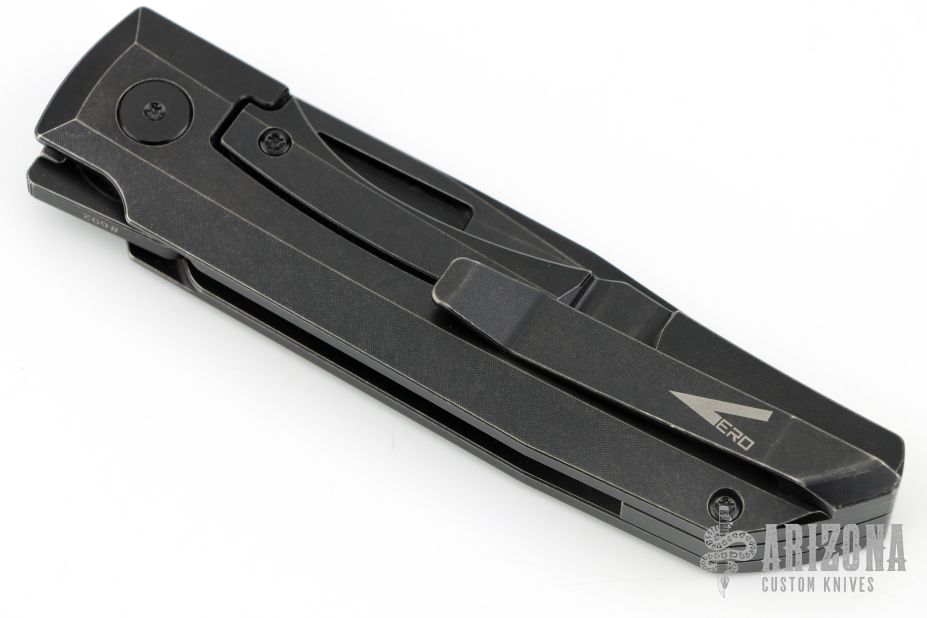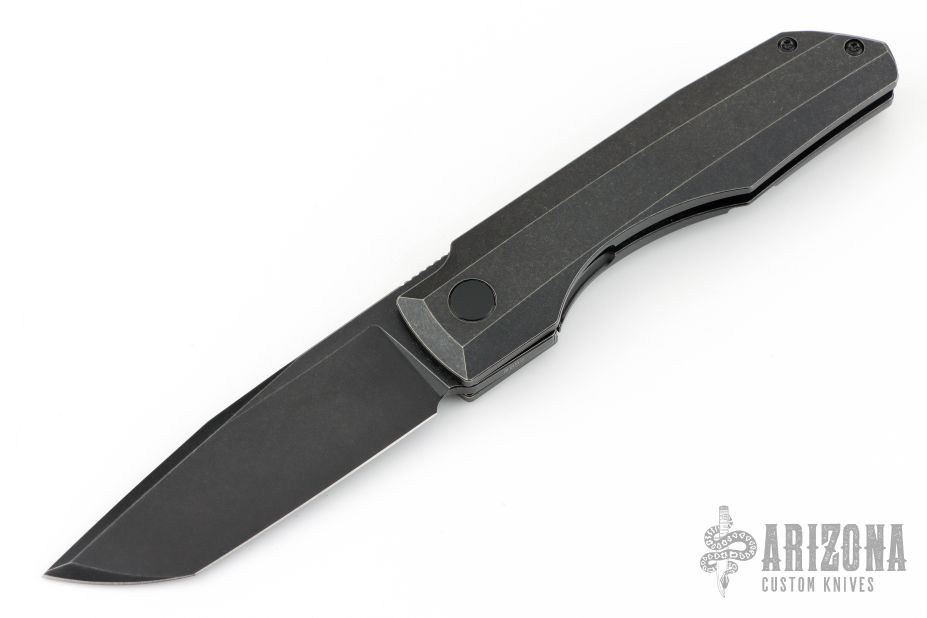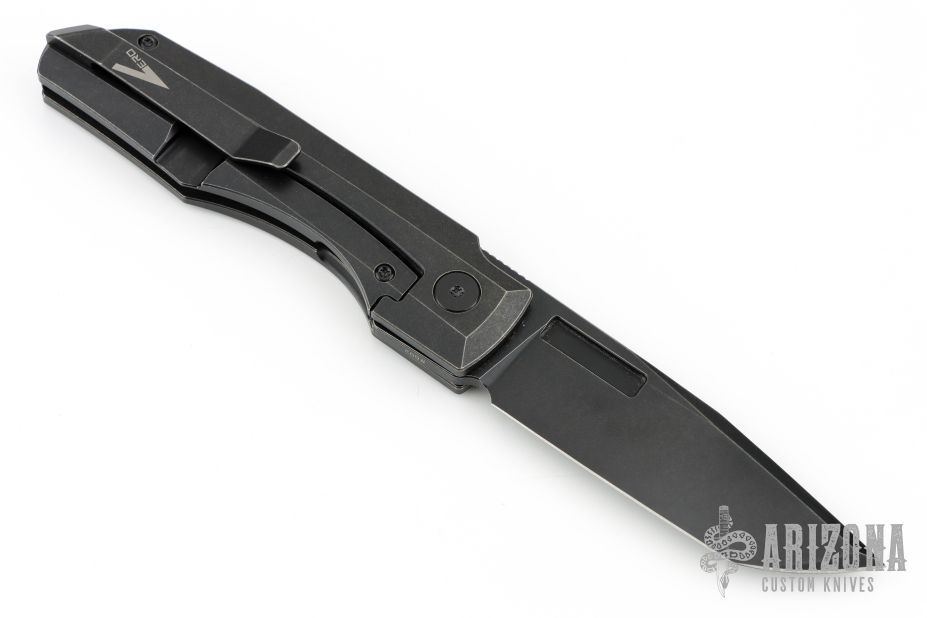This Impulse by Vero Engineering features a blackwashed blade with notched thumbrest and flipper. The handle has a blackwashed titanium frame with black titanium hardware, tip up clip with hidden screws and backspacer. Nice detent, lockup and blade seating. Comes with a zippered case and COA. Excellent condition.