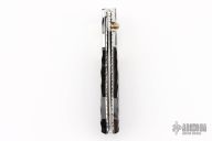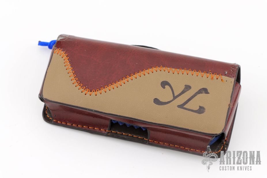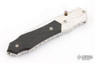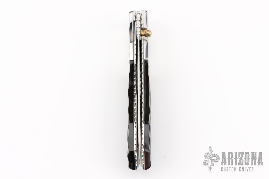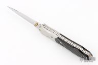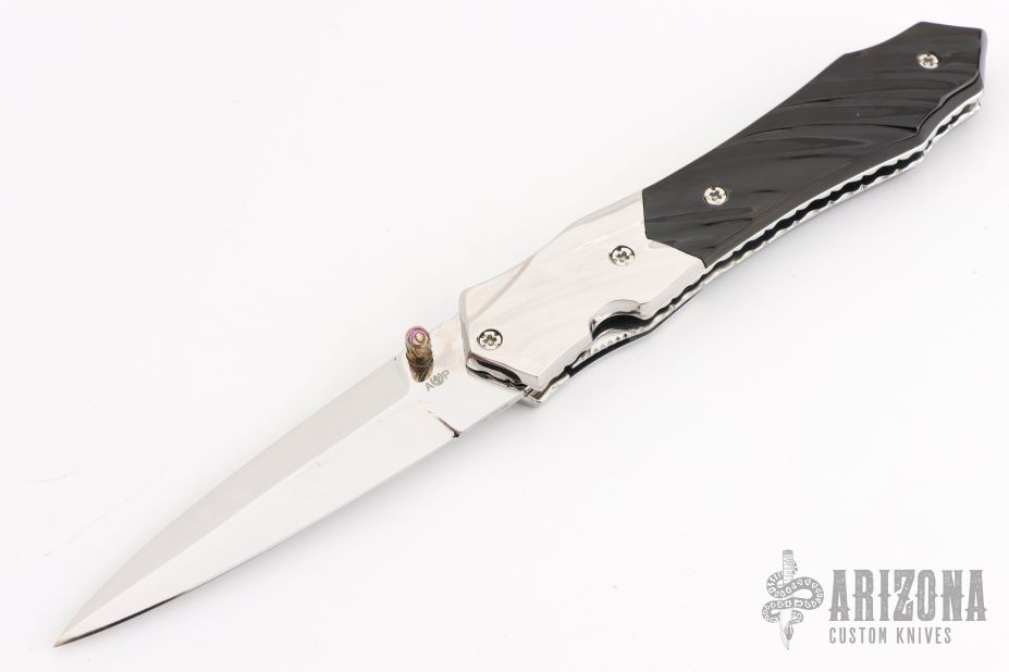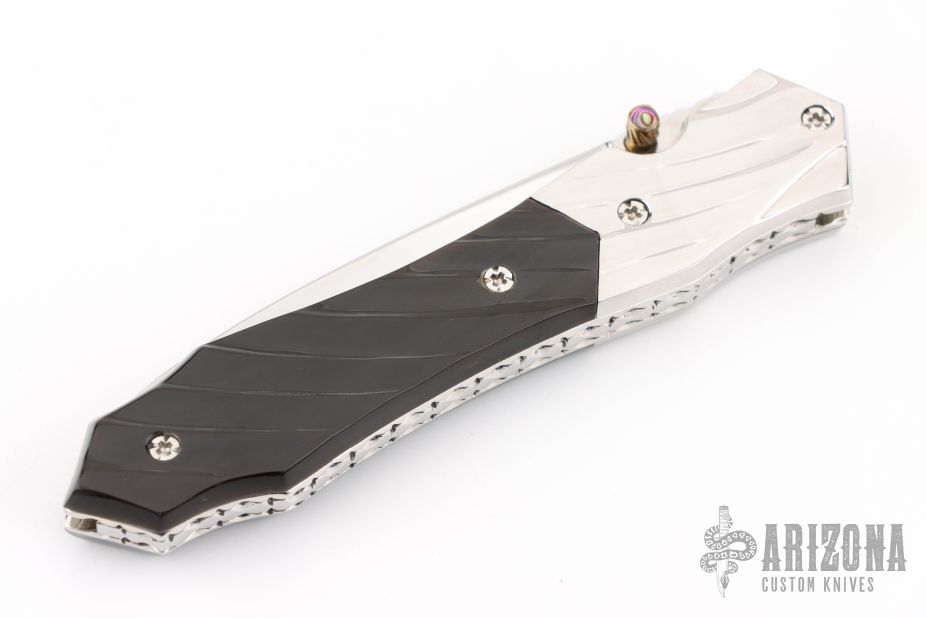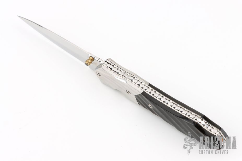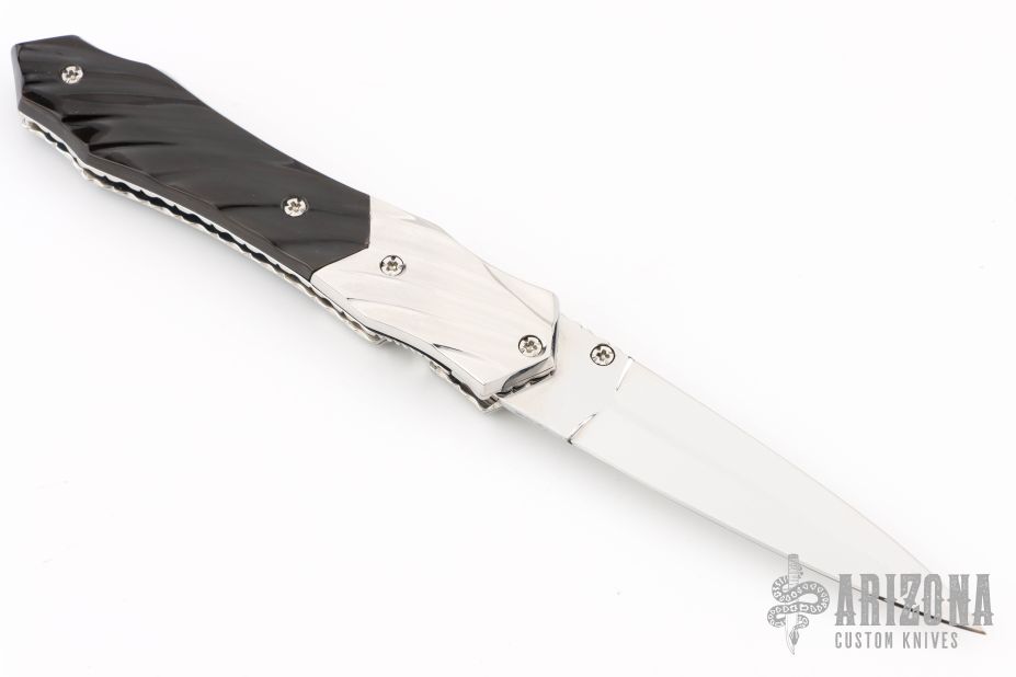 This linerlock by Appaloosa Knives features a mirror polished blade with a false top edge, fileworked thumbrest, single thumbstud with abalone inlay. The handle has polished and carved stainless steel bolsters, carved buffalo horn scales, fileworked stainless steel liners and backspacer. Excellent condition. Comes with a brown leather sheath.