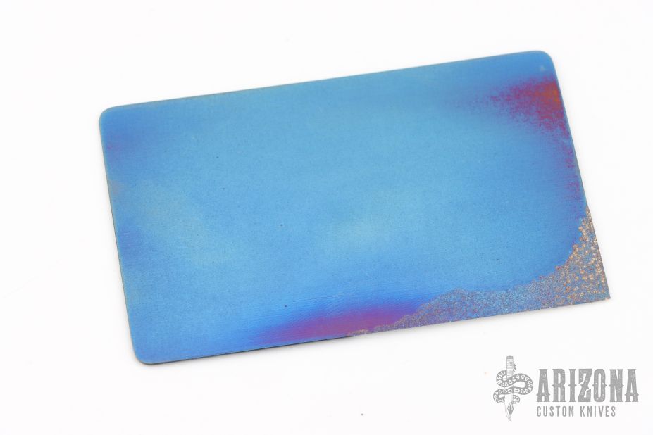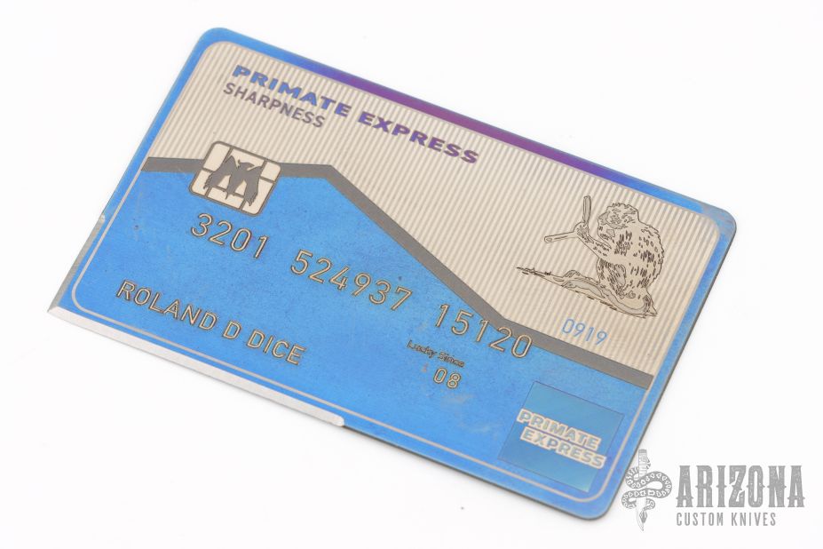 Primate Express Titanium Card Blade by Mummert Knives. Has Fiber Laser Color and Deep Etch. Tungsten carbide edge, RC 72. Comes with original packaging. Has scratches, good condition otherwise.