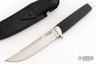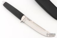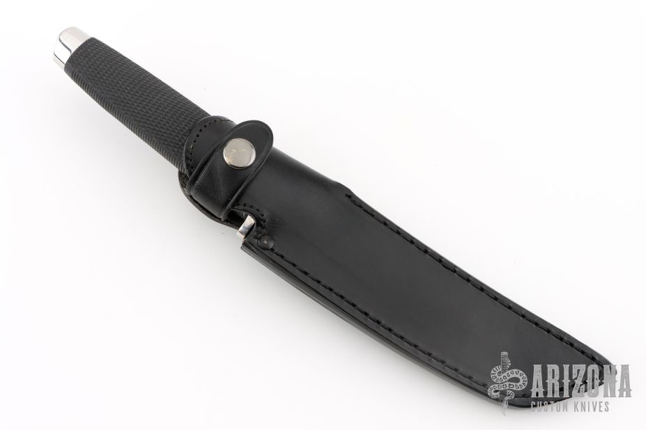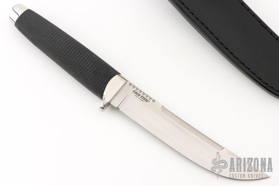 This Model Outdoorsman by Cold Steel features a satin finished blade with notched thumb rest, .188" blade stock and 1.097" blade depth, hidden tang construction.. The handle is comprised of a stainless steel guard and pommel and Kray-Ex grip. Includes a black leather sheath with belt loop. Has a couple light scratches, otherwise excellent condition.