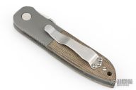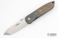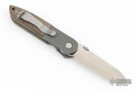 This Custom CQC-6 by Emerson features a chisel ground tanto blade with a satin finish, thumbdisc and notched thumbrest. The handle has bead blasted titanium dovetailed bolsters and titanium liners, green canvas micarta scales, black G-10 backspacer, and a tip up stainless steel clip. Nice detent, lockup and blade seating. Comes with original box and papers. Comes with original order form from 3/10/98, the invoice when the knife was completed on 3/9/2007, and the packing slip dated 3/9/2007. Excellent/unused condition.