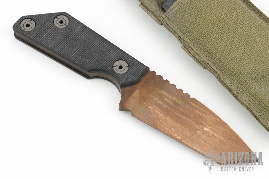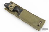 This Road Warrior 2 features Copper Beryllium blade with notched thumb rest, .283" blade thickness and 1.61" blade depth. Black Lego G-10 scales. Notches on thumbrest and rear of handle. Comes with nylon belt sheath. Has scratches on the blade, good condition otherwise.