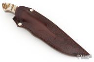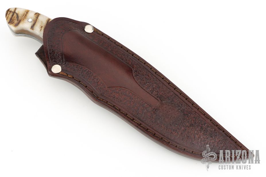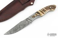 This Integral Hunting Knife by Black Ore Knives features a White Bloodline Mosaic Damascus blade with false top edge, .240" blade stock and 1.170" blade depth, full integral construction. The handle has integral keyhole bolsters, sheeps horn scales. Comes with a hand tooled brown leather sheath and COA. New from maker.