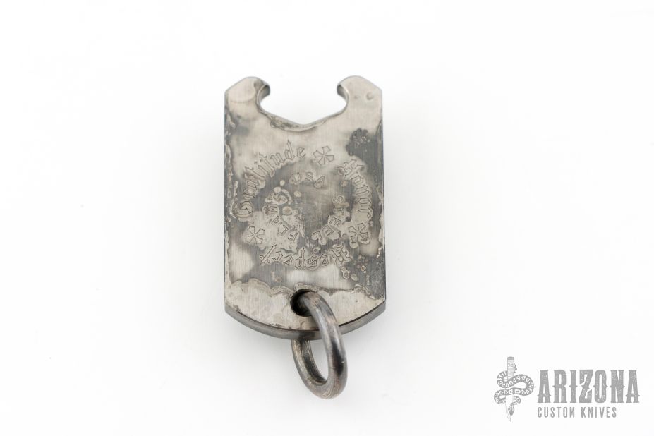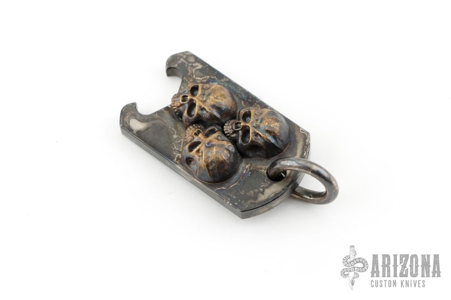 This Pile of Skulls EBO (Emergency Bottle Opener) from Steel Flame features a forced patina finish and ring that allows for easy attachment to a keyring, necklace, etc. Excellent condition.