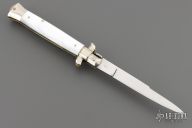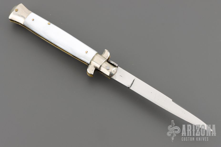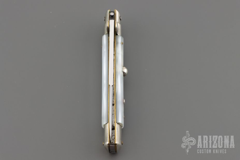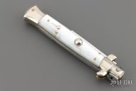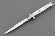 This auto features a spear point blade with a false top edge. Nickle silver guard and rear bolster and pearlex scales as well as brass liners. Nice function, strong firing. Has some light scratches and patina, otherwise excellent condition.