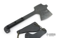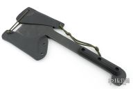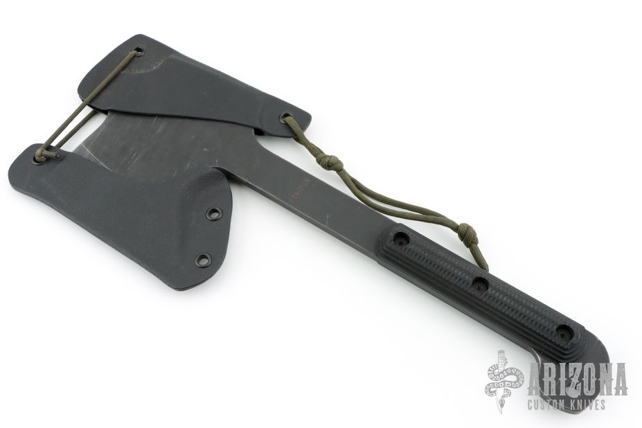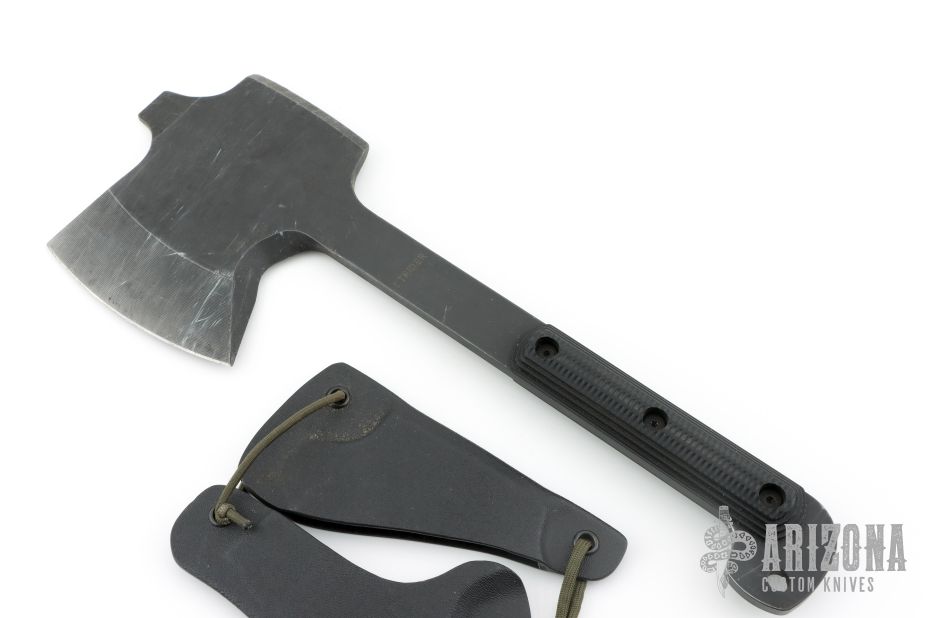 This BS Breacher's Tool by Strider Knives features a black blade and tang with black G-10 scales, .248" blade stock and a 4" blade. 5.125" from blade edge to poll, pry bar on the top of the head. The underside of the blade, the beard, is sharpened. Comes with a two-pice kydex sheath. Has scuffs and scratches, has been used alot, otherwise still good user condition. This is an original of the knife that RMJ and Mick Strider collaborated on.