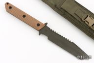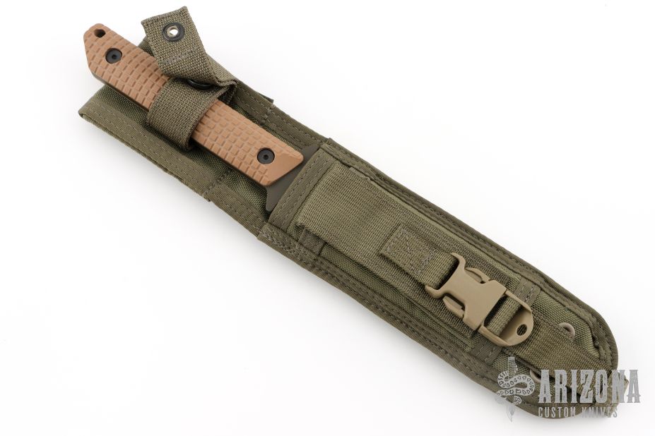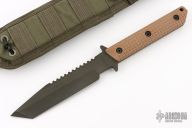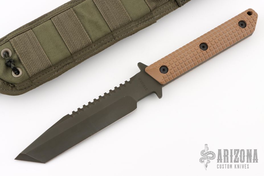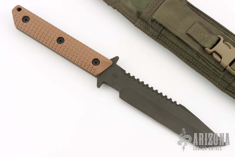 This BTSS from Mick Strider features a black clip point tanto style blade with serrations on the spine, .257" blade stock and 1.301" blade depth. The handle has coyote brown frag pattern G-10 scales over full tang construction with a lanyard hole. Includes nylon sheath with belt loop. Has some light scuffs, otherwise excellent condition. Comes with a zippered case.