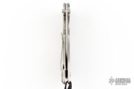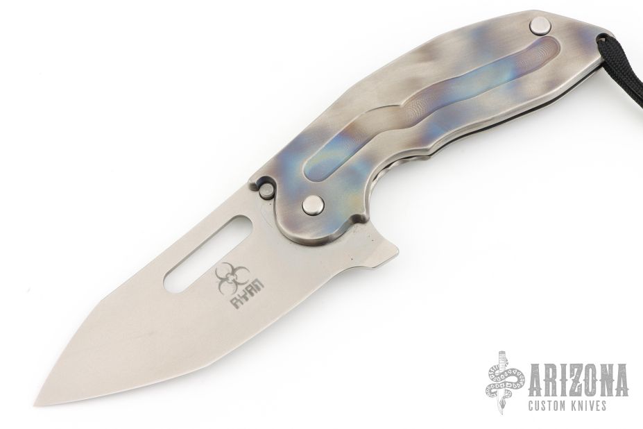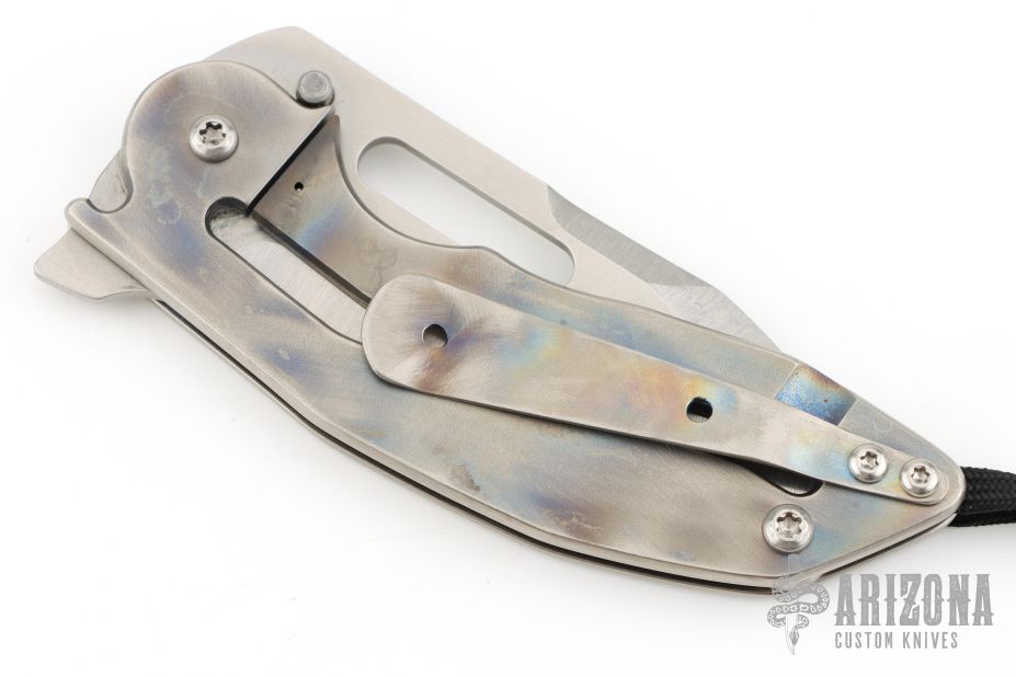 This framelock flipper by Steve Ryan features a bead blast finished chisel grind tanto blade with false top edge and dual thumbstuds. The handle has a flamed titanium frame with a matching tip up titanium clip. Nice detent, blade seating and lockup. Has some light scuffs and scratches, great condition otherwise.